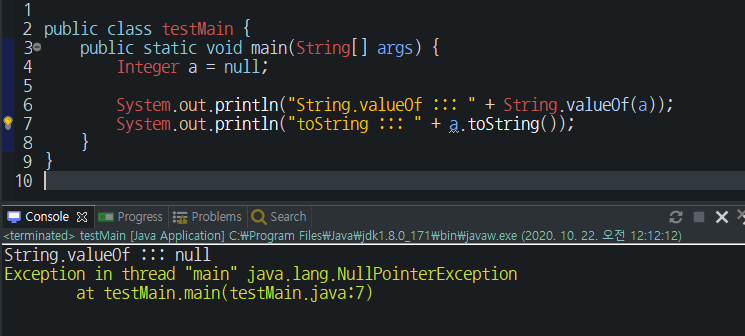 toString()의 경우에는 NullPointException을 발생시키게 됩니다.