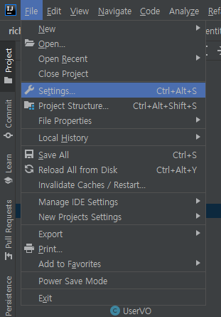 우선은 File - Settings 를 클릭 해서 IntelliJ 설정으로 들어간다.