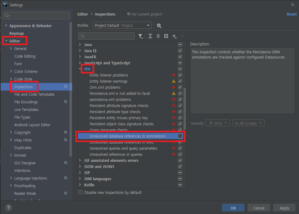 "Unresolved database references in annotations" 을 체크 해제 해주니