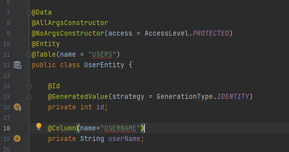 @Table의 name 값에 있던 빨간줄이 사라졌다.