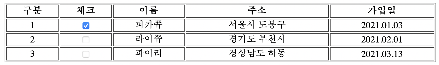 row의 경우에는 선택한 checkbox에서 가장 가까운 tr을 리턴하기에 "피카쮸"가 있는 로우를 리턴,