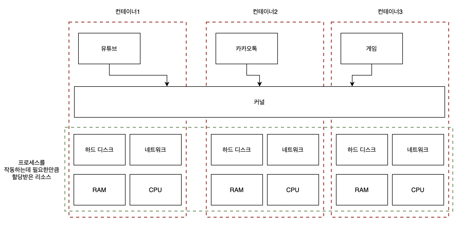 아래 초록색 박스는 컨테이너를 격리하면서 할당 받은 리소스의 양이다.