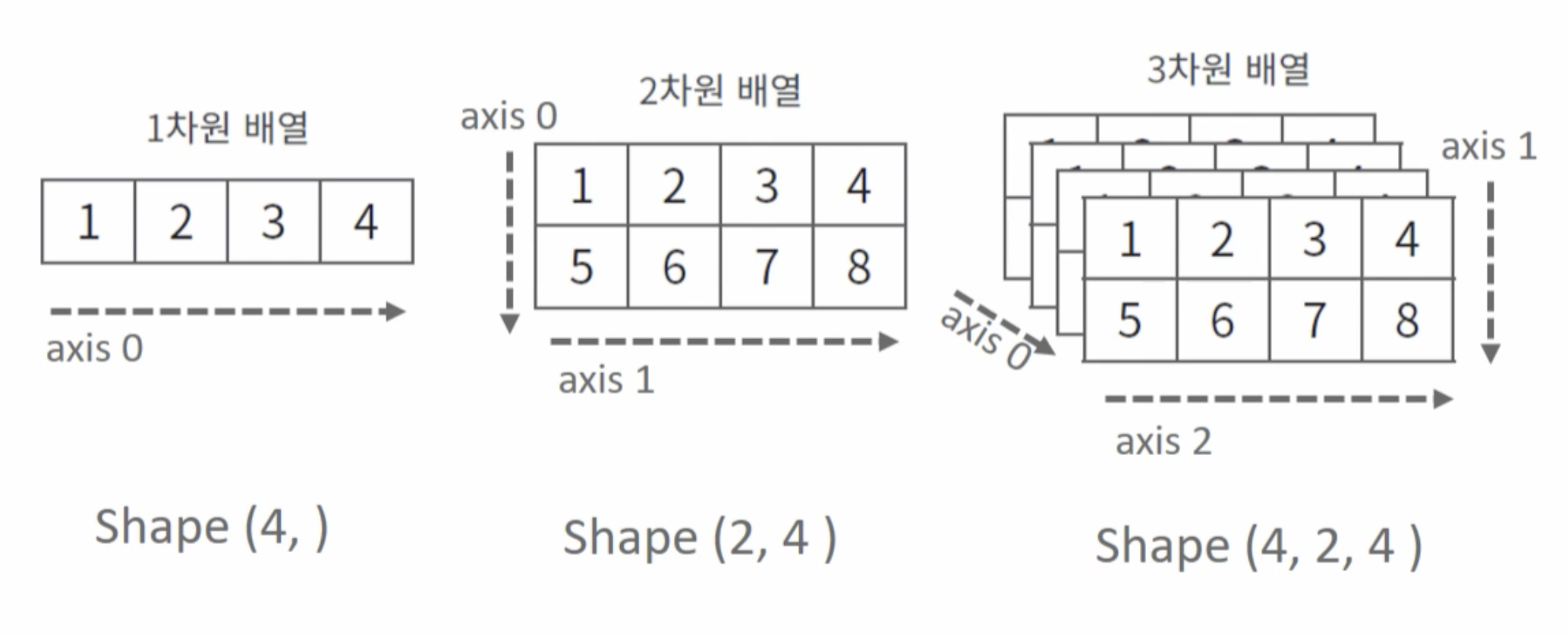 : axis0, axis1, axis2로 부여되는데, 차원에 따라 axis가 다르게 부여된다.